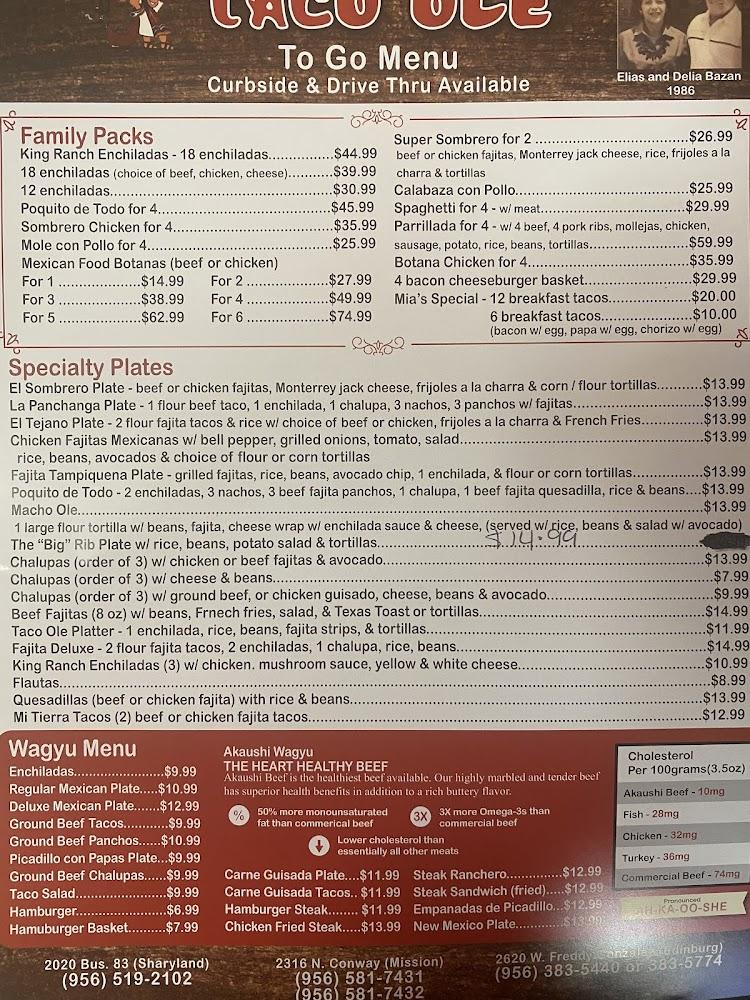 Taco Ole features a diverse menu that offers something for everyone. Breakfast includes favorites like Papas Con Huevo and Chorizo Con Huevo tacos. Lunch and dinner dishes shine with Chicken Enchiladas and Ranchero Steak. Their traditional soups, like Menudo and Caldo Tlalpeno, warm the soul. Unique specialty plates combine bold flavors and traditional cooking methods. The menu also includes American favorites, such as burgers, catering to varied tastes. With so many dishes to choose from, diners can explore flavors that honor Mexican cuisine. Enjoy family packs for larger gatherings, bringing everyone together for a hearty meal.